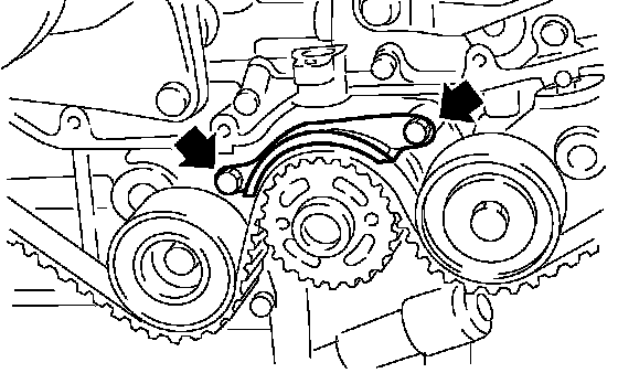 2. Using white paint, put an alignment mark or an arrow mark on timing belts in relation to the crank sprocket and cam sprockets.