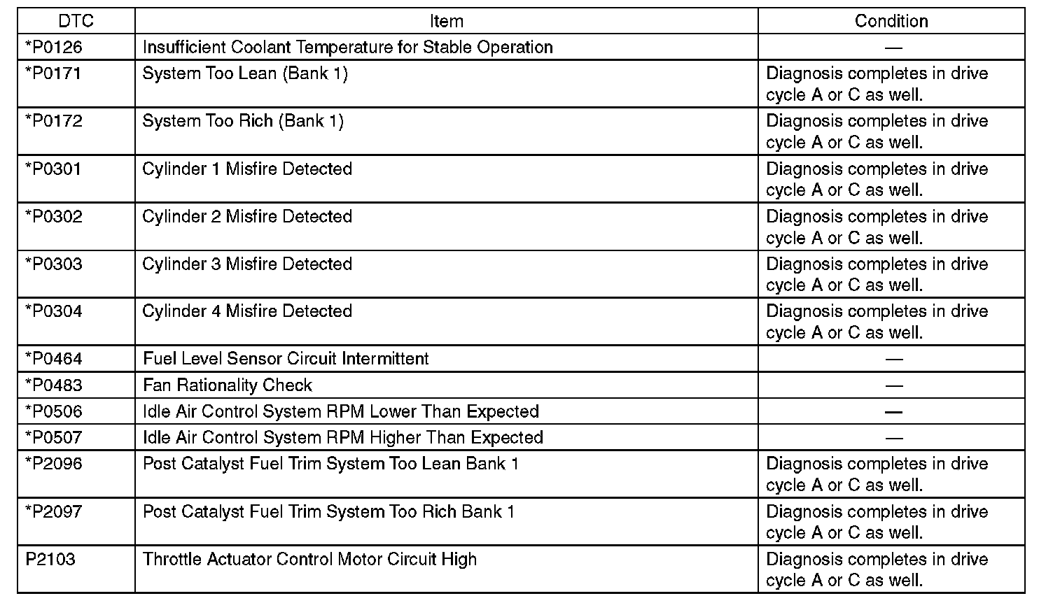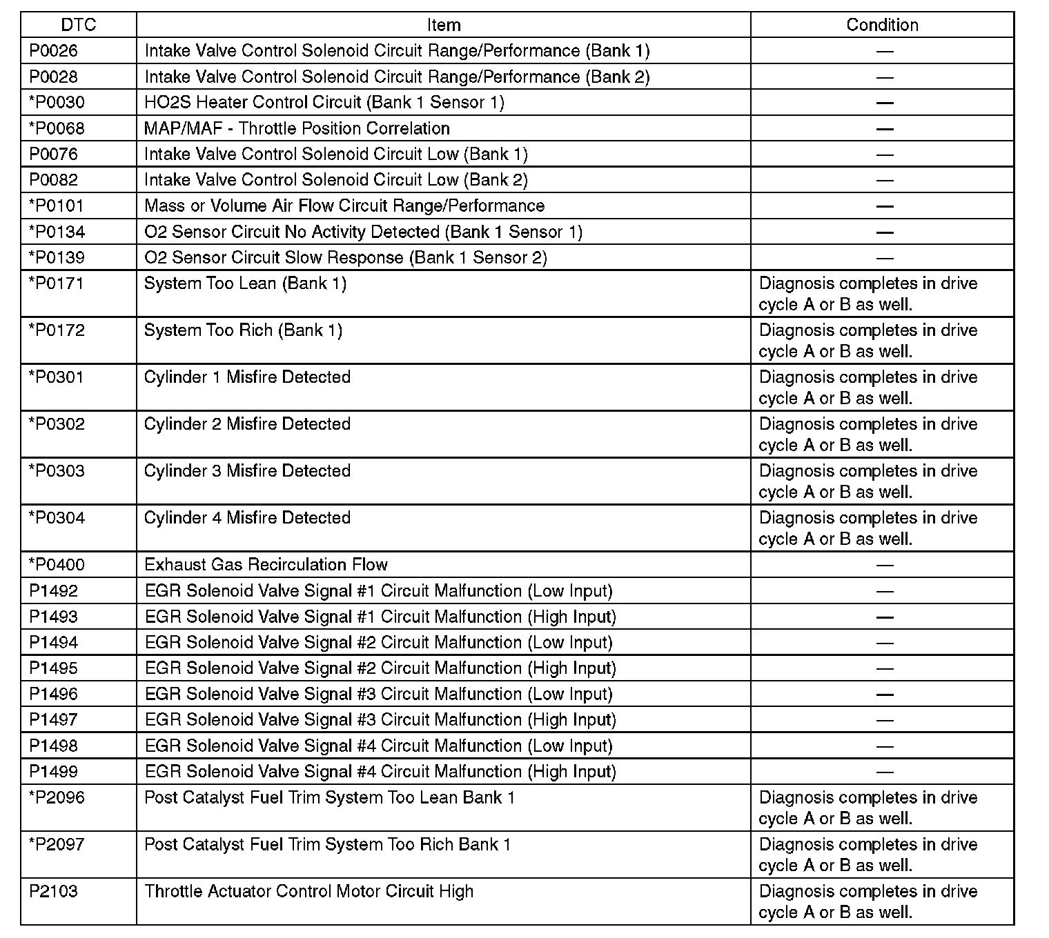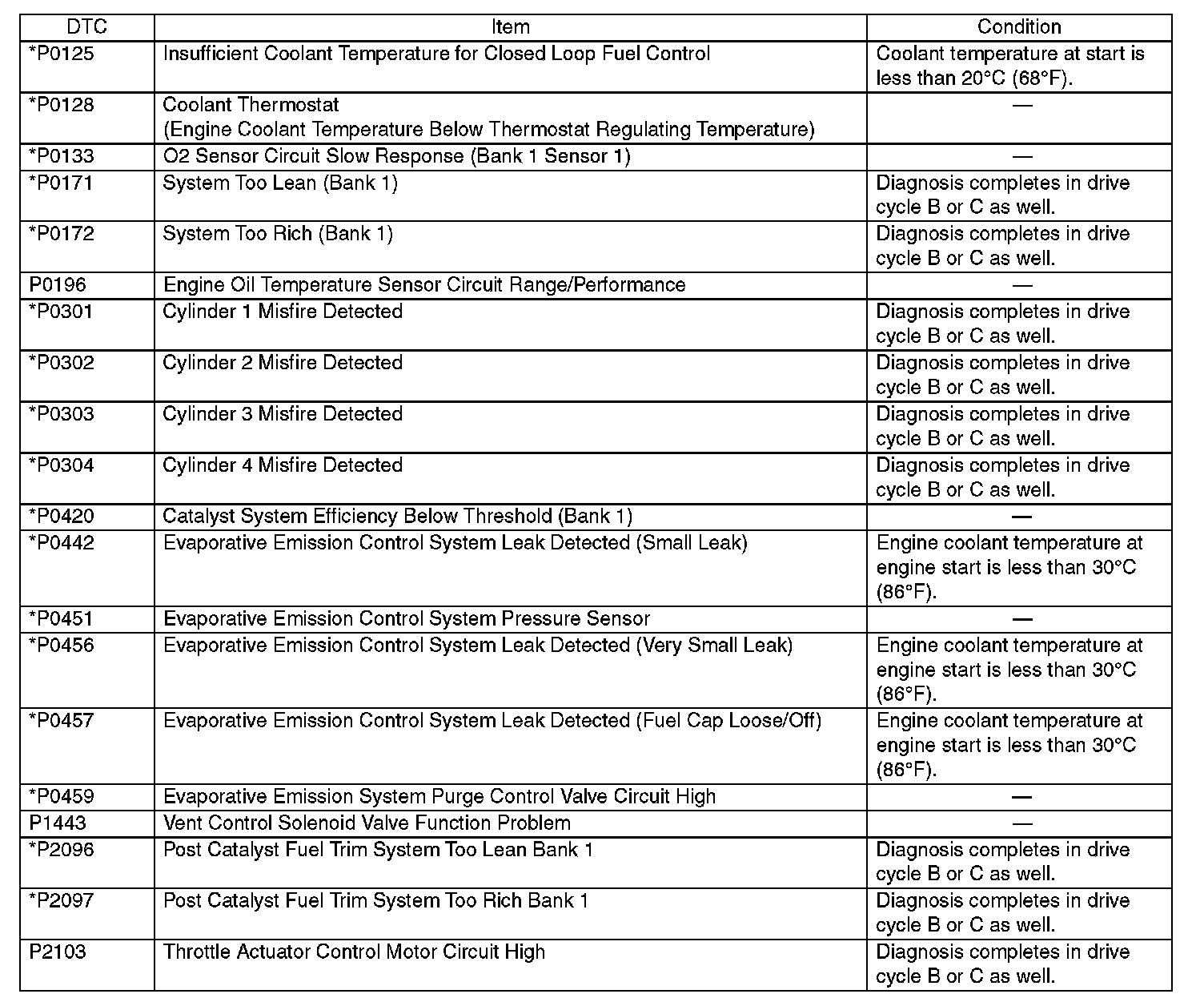 - Perform the diagnosis twice if the DTC marked with *. After completing the first diagnosis, stop the engine and perform second diagnosis in same condition.
