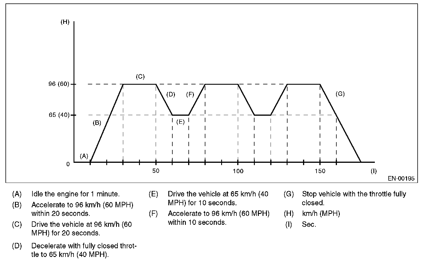 2. DRIVE CYCLE A (AFTER RUNNING 20 MINUTES AT 80 KM/H (50 MPH), IDLE THE ENGINE FOR 1 MINUTE.)
