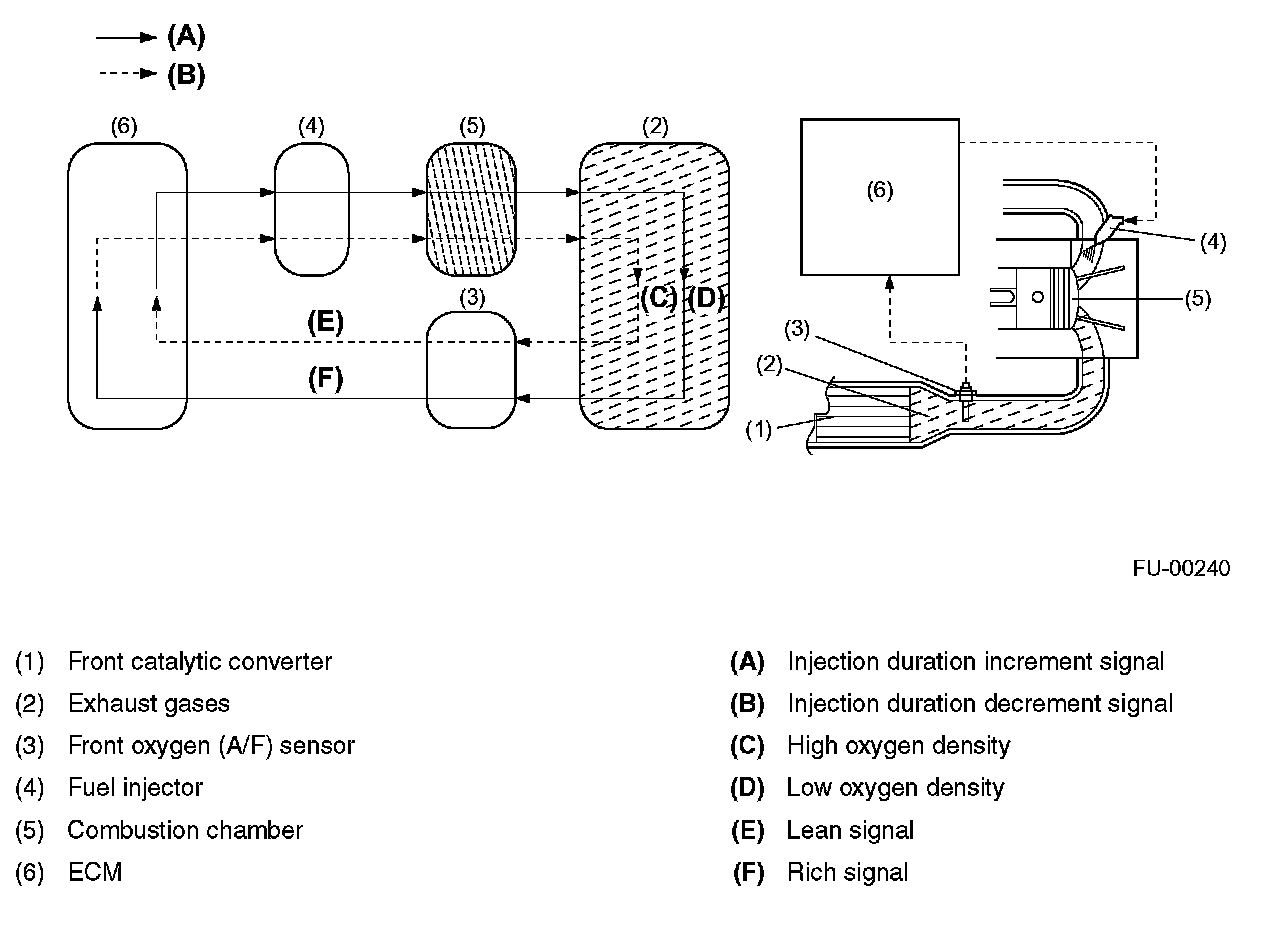 - In the air-fuel ratio feedback control, the ECM calculates the necessary amount of correction based on data from the front oxygen (A/F) sensor and adds the result to the basic duration (which is stored in the ECM's memory for each condition defined by the engine speed and various loads.)