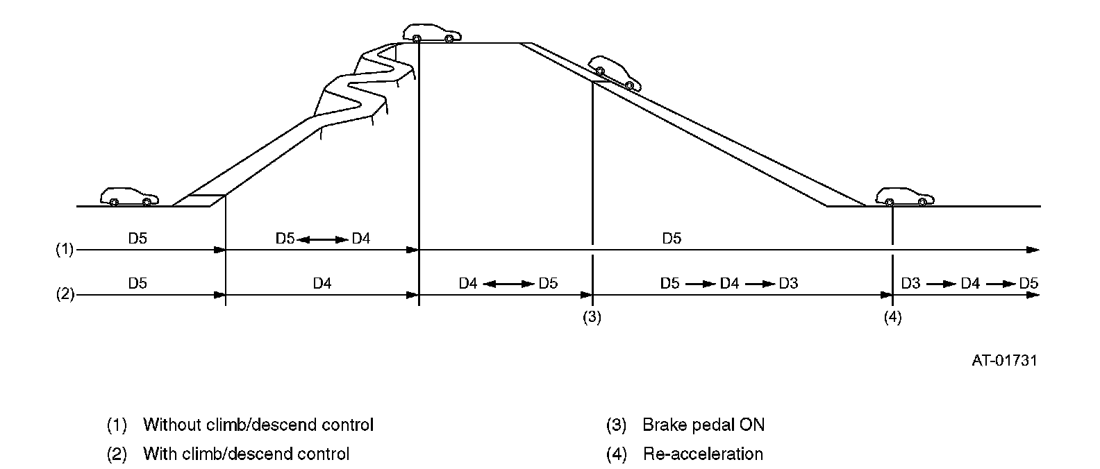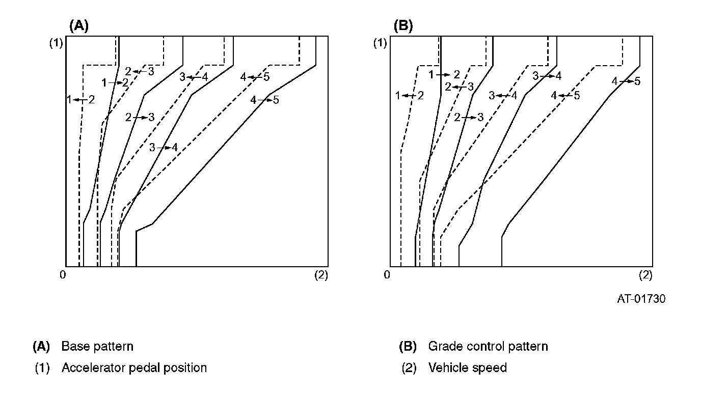 When the accelerator pedal is quickly depressed, the TCM interprets this as acceleration is required, and the transmission is downshifted earlier to obtain a greater drive force.