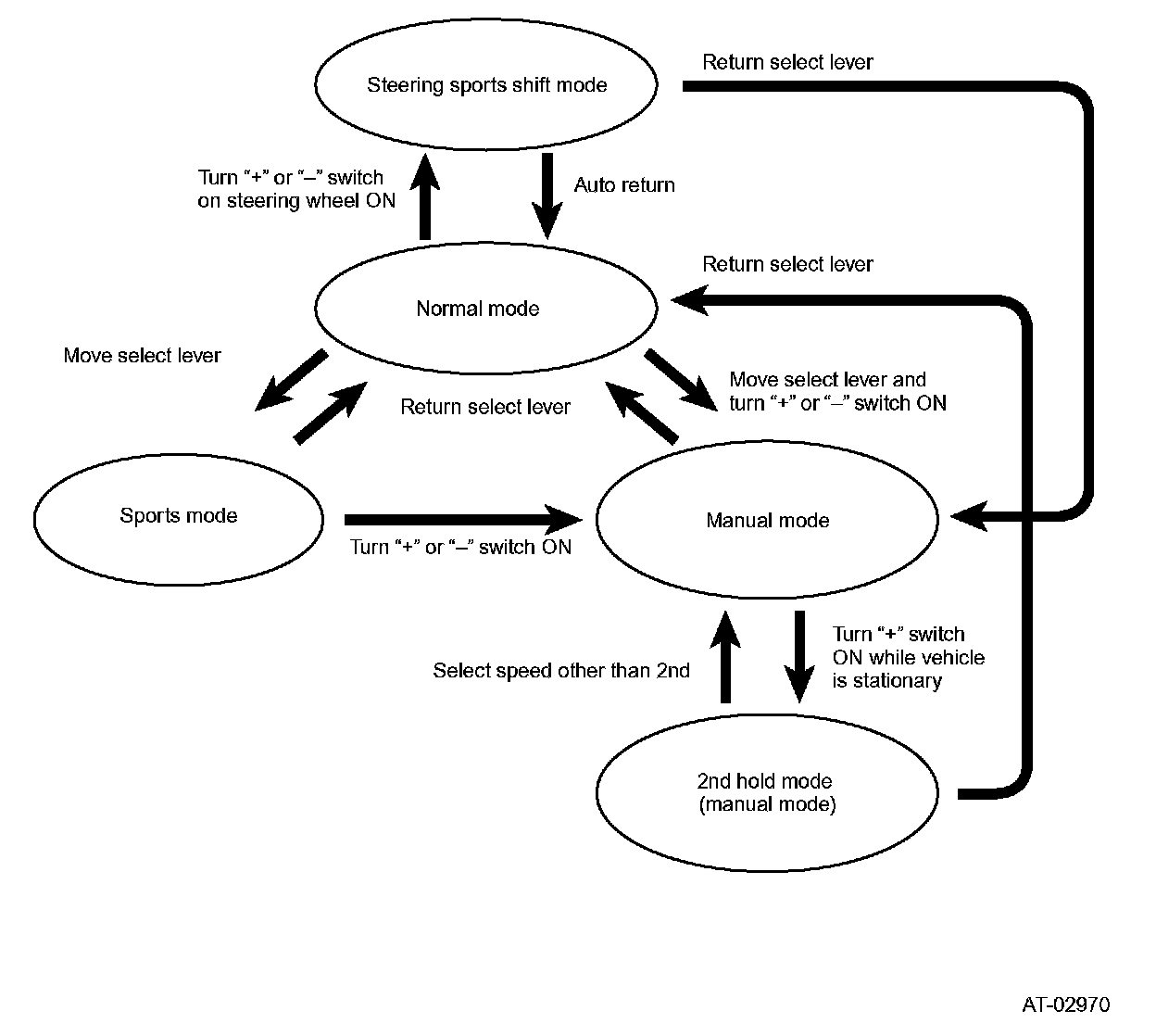 The gear upshifts each time the "+" switch is operated, however, when the vehicle speed is too low for the selected gear speed, the TCM inhibits further upshifting. If the vehicle speed becomes too slow for the current gear speed, a downshift will be made automatically to prevent engine stall. When the vehicle comes to a stop, the transmission will always be controlled to shift to 1st speed unless the vehicle was in manual 2nd hold control.