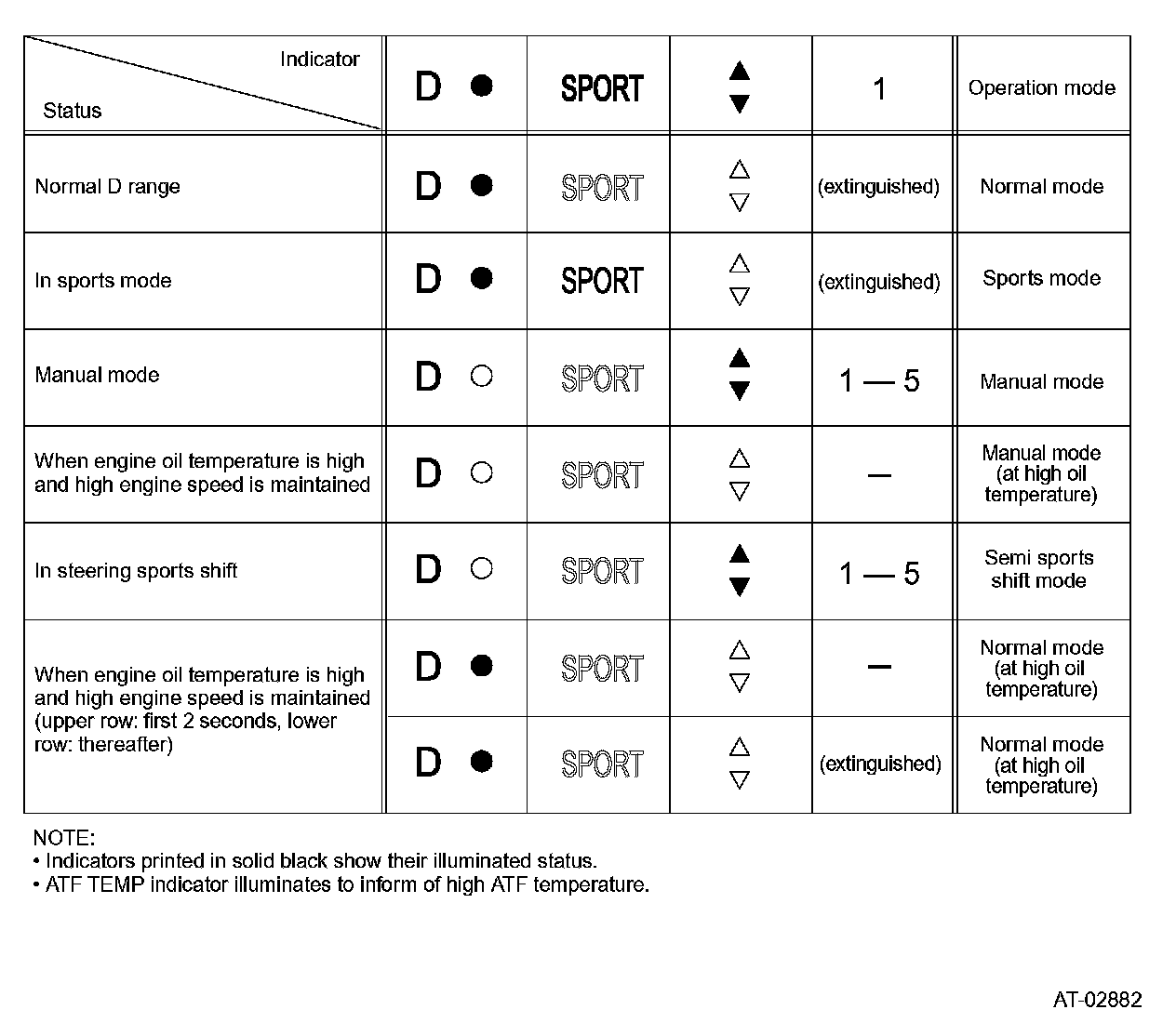 Illuminations of the various indicators on the combination meter are controlled in accordance with the shift pattern selection as shown in the table.