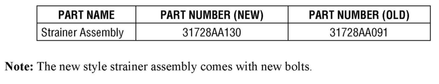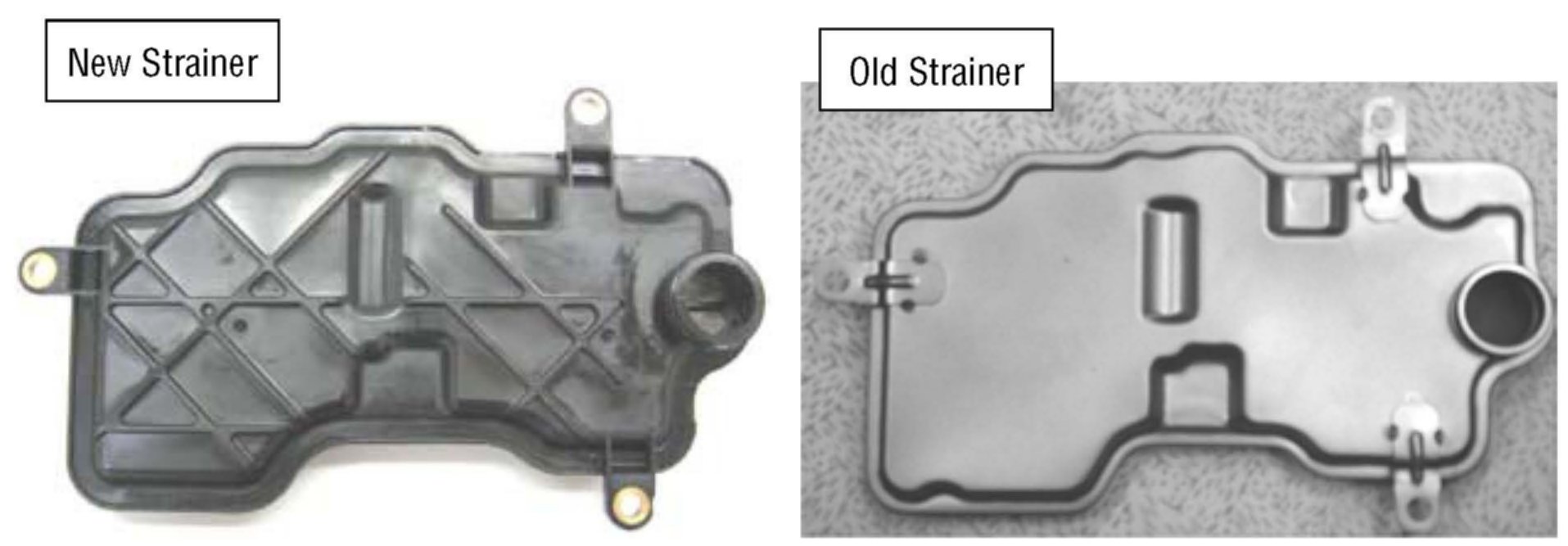 The purpose of this bulletin is to inform you that the automatic transmission strainer has changed from being made out of metal to resin. The length of the bolts and the torque specification has also changed.