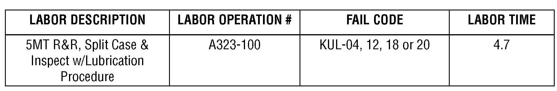 The following claim information may only be used when installing a new transmission assembly. Labor operation A323-100 includes the time for performing the procedure listed in this bulletin.