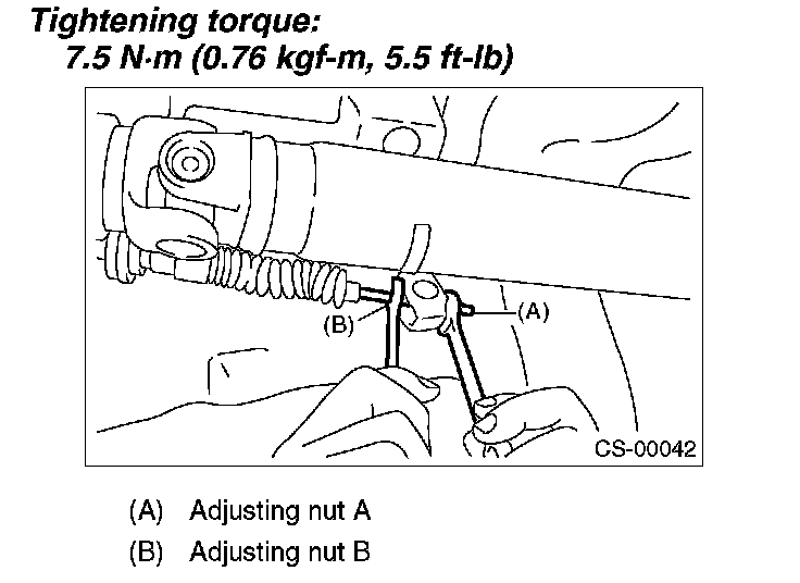 5) With the select lever pushed towards the rear of the vehicle, turn the adjustment nut B until it just contacts the connector. Then loosen the nut for 1/2 turn.