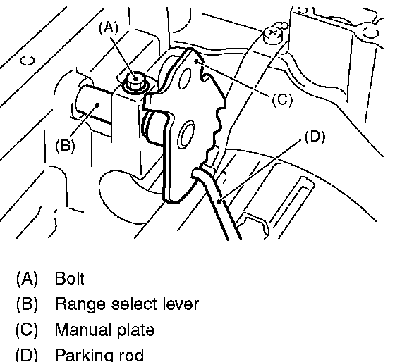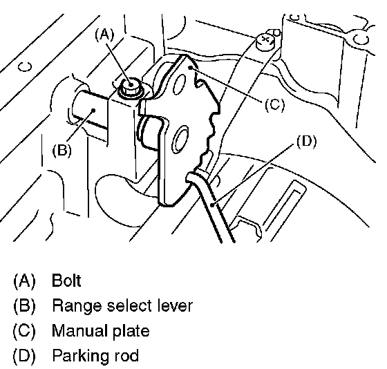 12. Remove the bolts securing select lever, and then remove the select lever, manual plate and parking rod.
