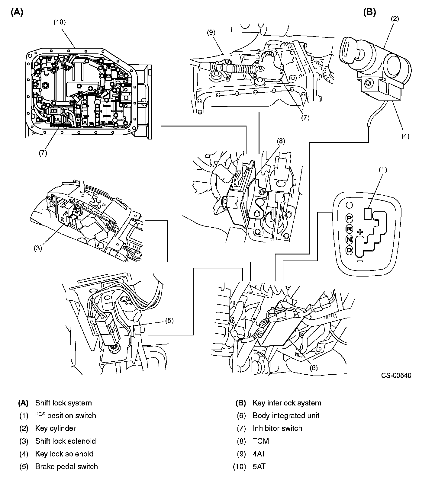GENERALTo increase safety during standing start, the shift lock system prevents movement of the select lever from the "P" position to any other position unless the brake pedal is depressed. This system is also provided with a key interlock function which prevents removal of the ignition key from the key cylinder unless the selector lever is placed in the "P" position.