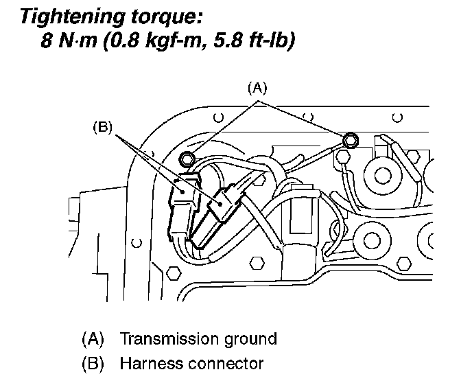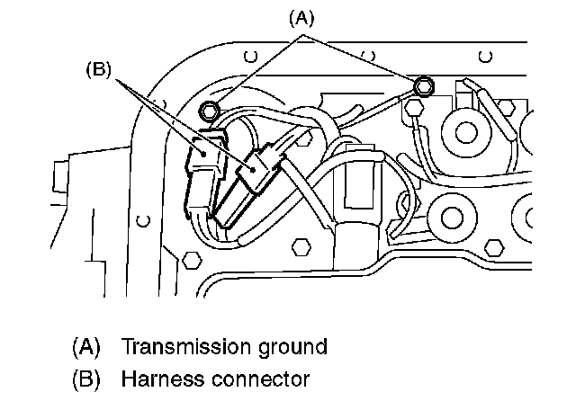 21. Disconnect the harness connector and transmission ground terminal.