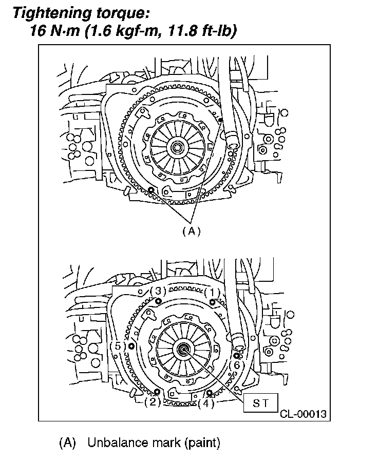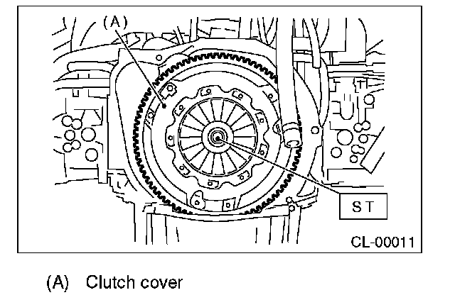 2) Install the clutch cover to the flywheel and tighten the bolts to the specified torque.