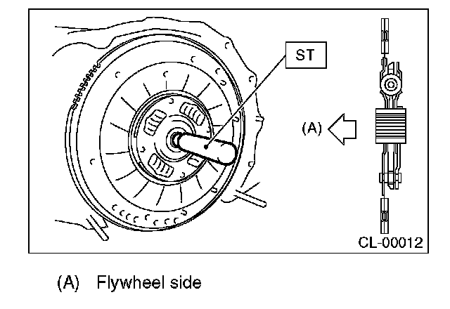 1) Insert the ST into the clutch disc and attach to the flywheel by inserting the ST end into pilot bearing.