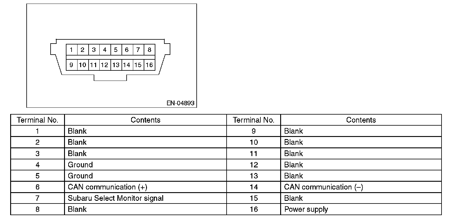 CAUTION: Do not connect any scan tools except Subaru Select Monitor or general scan tool because the circuit for Subaru Select Monitor may be damaged.