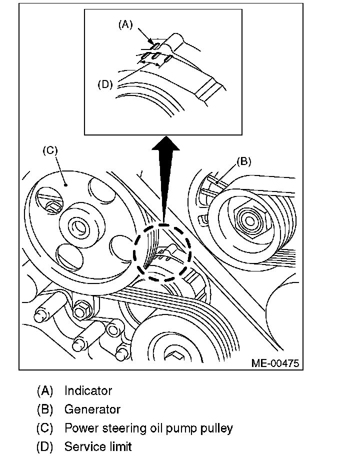 2) Make sure that the V-belt automatic belt tension indicator (A) is within the range (D).