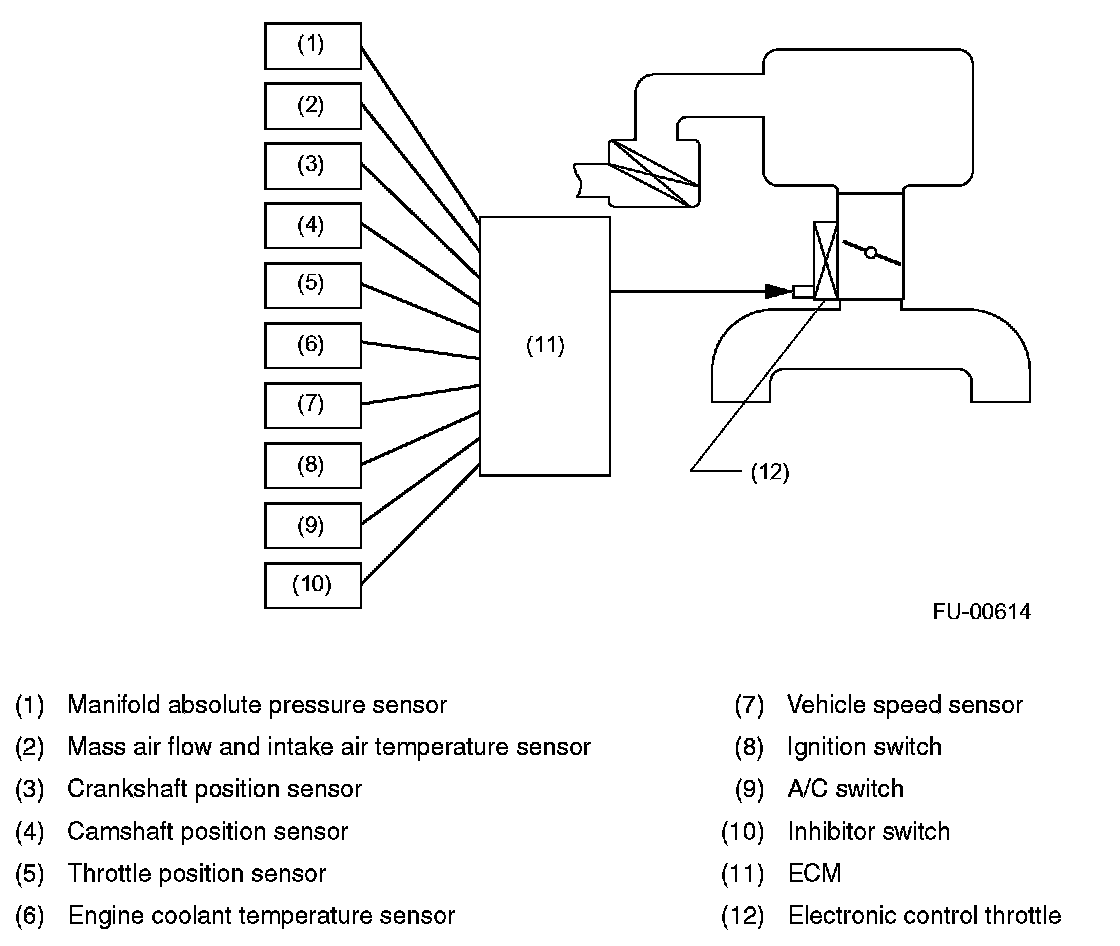 IDLE AIR CONTROL- The ECM controls the electronic control throttle based on signals from the crankshaft position sensor, engine coolant temperature sensor, air flow and intake air temperature sensor, and A/C switch etc. so that the proper idle speed for each engine load is achieved.