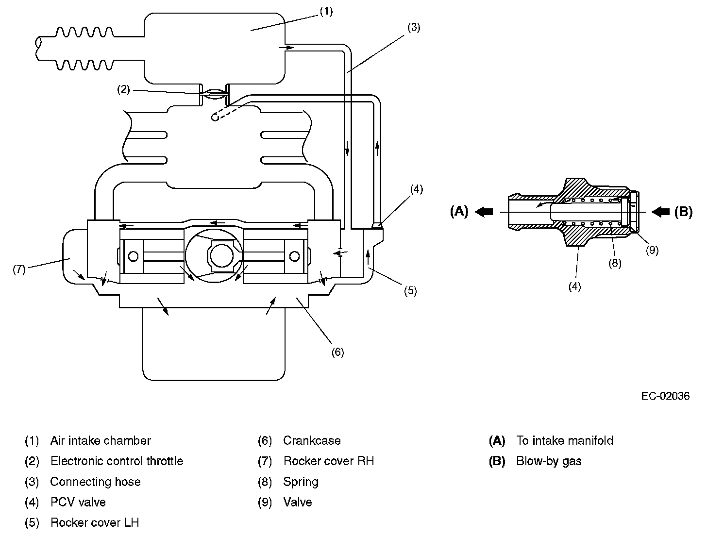 Crankcase Emission Control SystemThe positive crankcase ventilation (PCV) system prevents air pollution that will be caused by blowby gas being emitted from the crankcase.