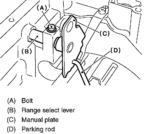 9. Remove the bolts securing select lever, and then remove the select lever, manual plate and parking rod.