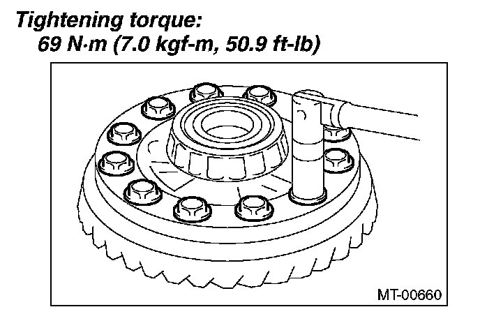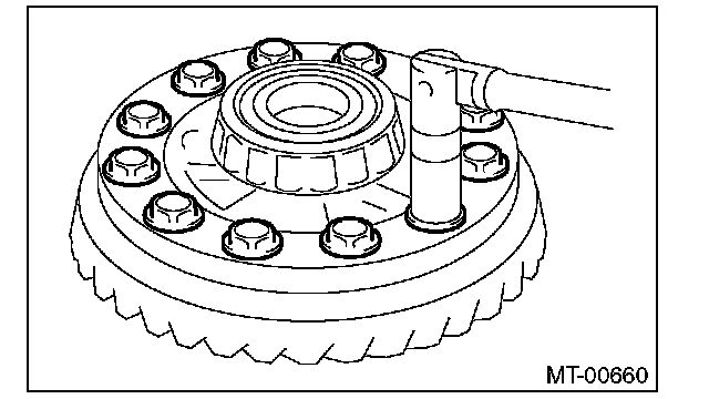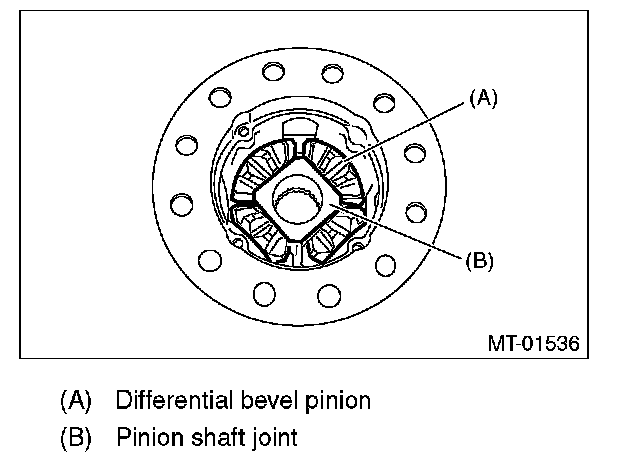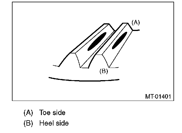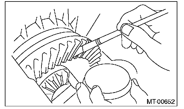 5) Remove the drive pinion shaft assembly, and inspect the mating condition of the teeth. If tooth contact is not correct, perform adjustment.