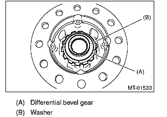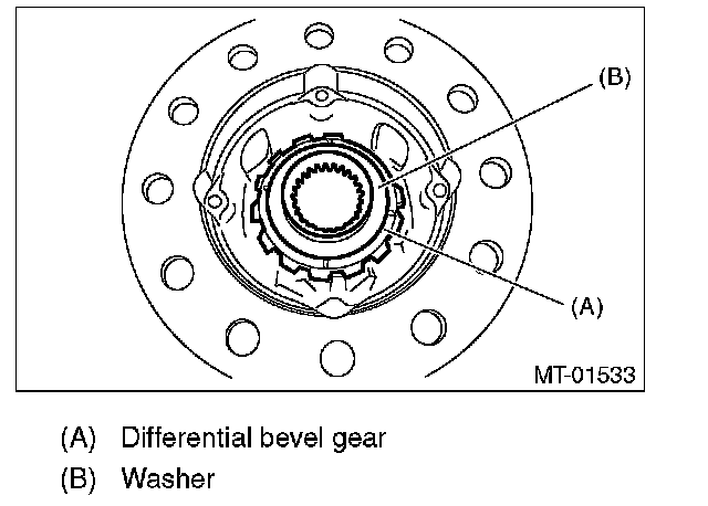 Measure the backlash of the differential bevel pinion. If backlash is not within standard value, install a suitable washer to adjust.
