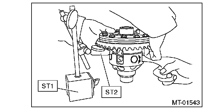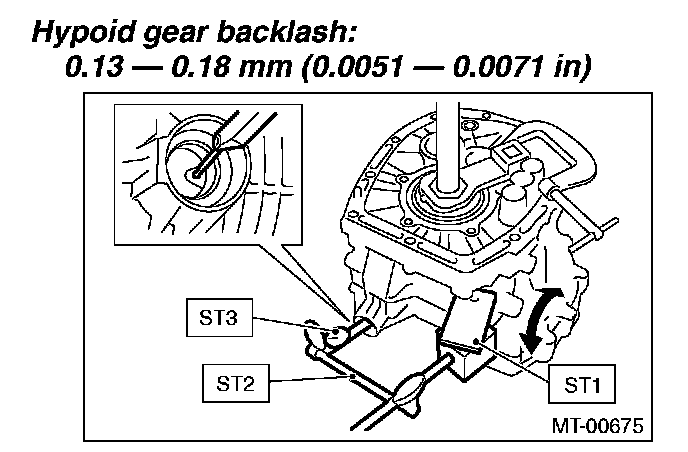 10) After turning the drive pinion shaft several turns, use the ST to measure the hypoid gear backlash.