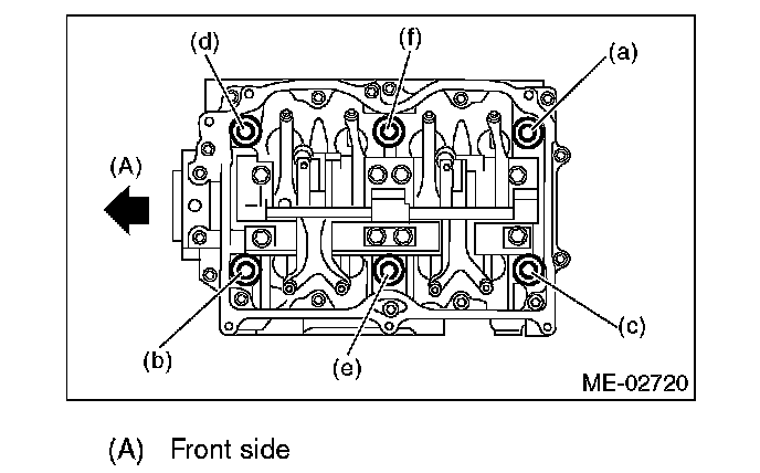 b. Tighten all bolts to 29 Nm (3.0 kgf-m, 22 ft. lbs.) in alphabetical sequence. Then tighten all bolts to 69 Nm (7.0 kgf-m, 51 ft. lbs.) in alphabetical sequence.