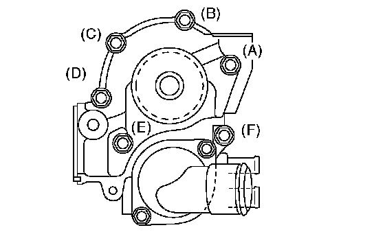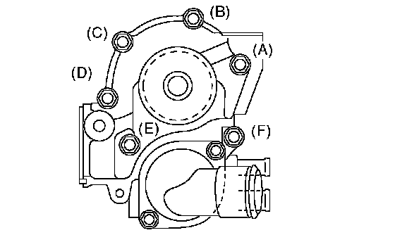 ^ When installing the water pump, tighten bolts in two stages in alphabetical sequence as shown in the figure.