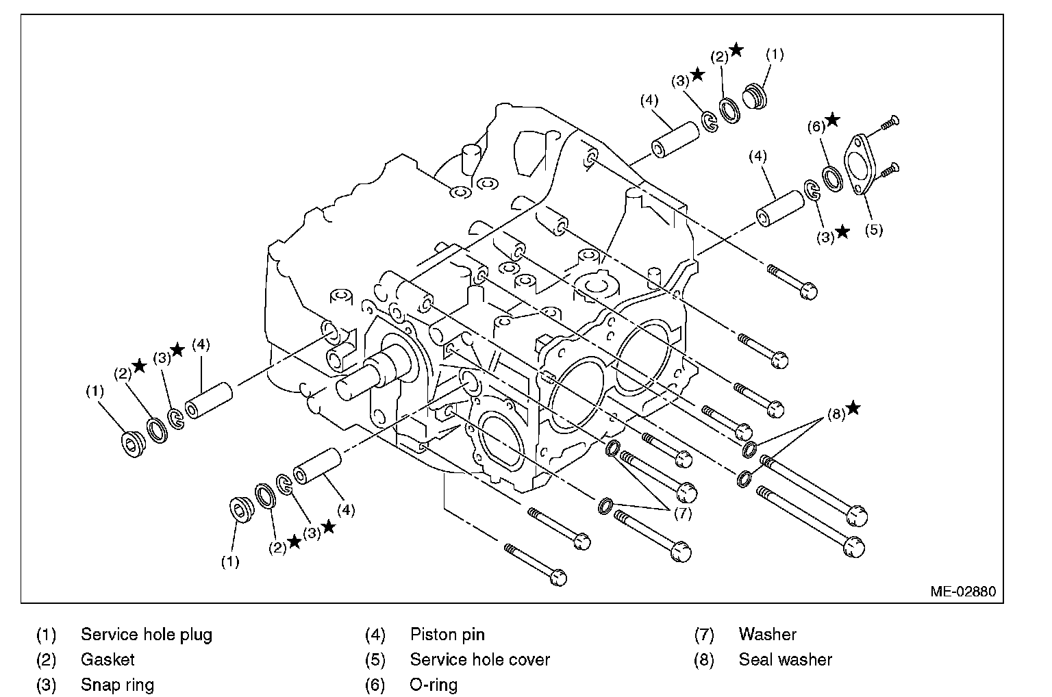 29. Rotate the crankshaft to bring #1 and #2 pistons to bottom dead center position, then remove the piston snap ring through service hole of #1 and #2 cylinders.