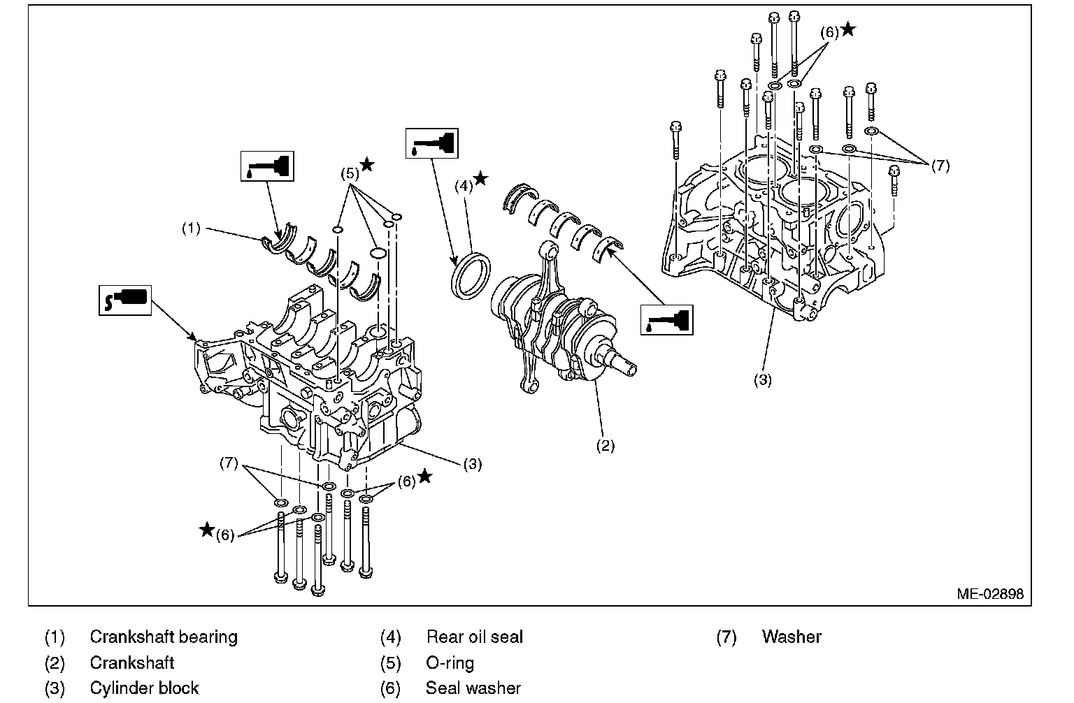 NOTE: Remove oil on the mating surface of bearing and cylinder block before installation. Apply engine oil to crankshaft pins.