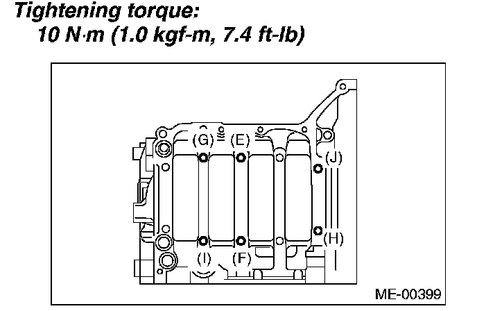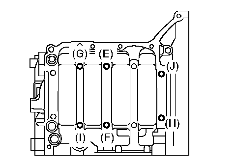 5. Tighten the 10 mm cylinder block connecting bolts on RH side (E - J) in alphabetical sequence.