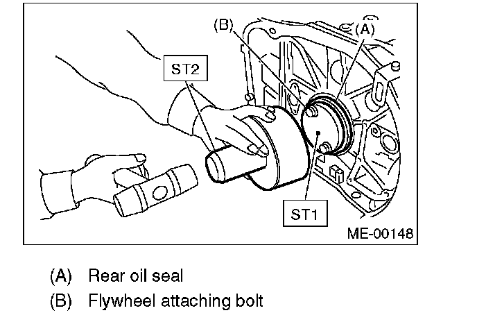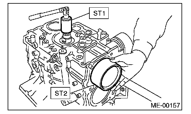 11. Apply engine oil to the outer perimeter of rear oil seal, and install the rear oil seal using ST1 and ST2.