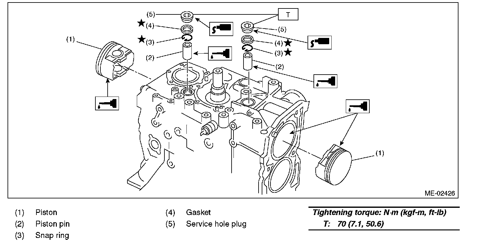 c. Apply a coat of engine oil to piston pin, and insert the piston pin into piston and connecting rod through service hole.
