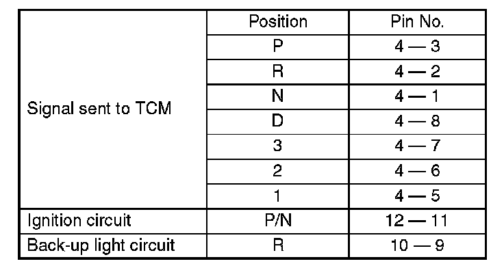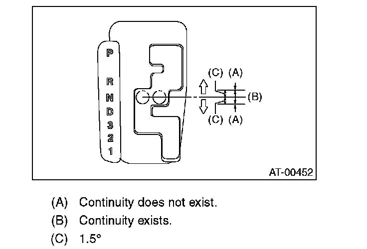 3) Check if there is continuity at equal points when the select lever is tilted 1.5° in both directions from "N" range.