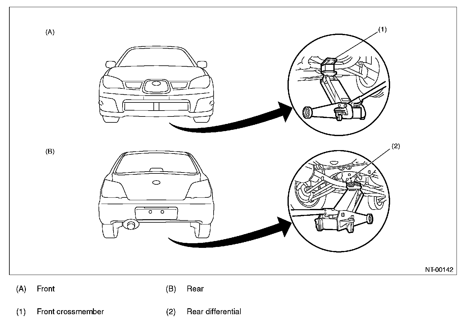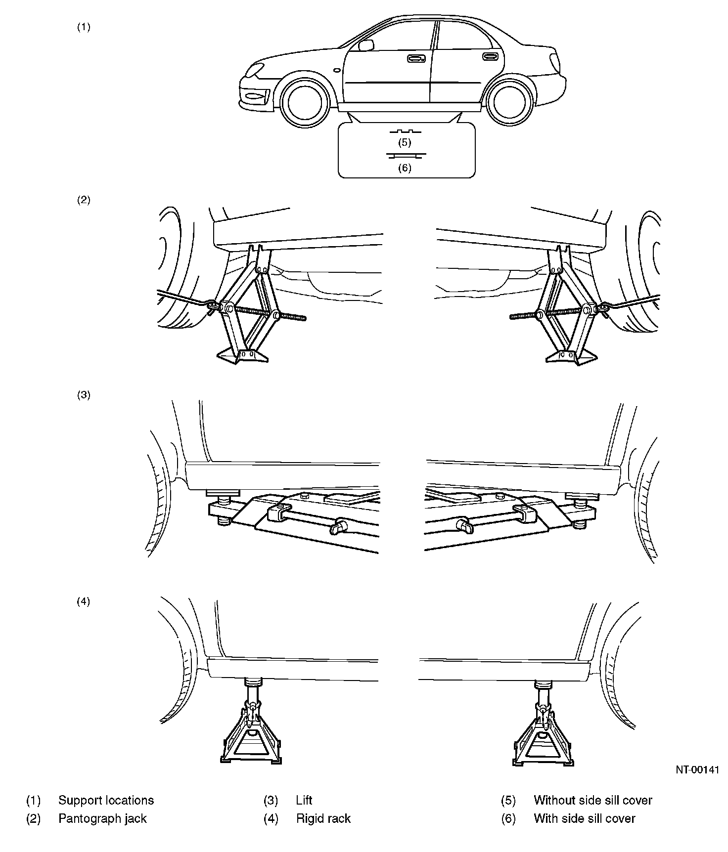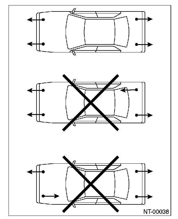 When using a lift or rigid racks to raise a vehicle, always follow instructions concerning jack-up points and weight limits to prevent the vehicle from falling, which could result in injury. Be especially careful to make sure the vehicle is balanced before raising it. Be sure to set the wheel stoppers when jacking-up only the front or rear of the vehicle.