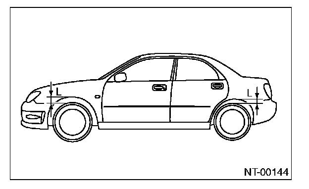 Measure the distance "L" from tire highest point to arch highest point before tie-down and after tiedown. Difference of measurement value (drop height) shall be within 50 mm (1.97 in). Make sure to fix the vehicle securely.