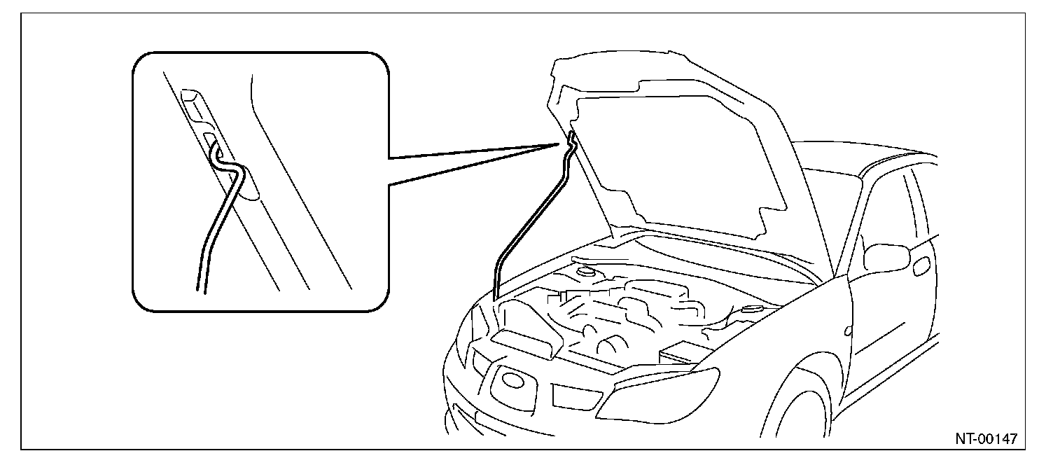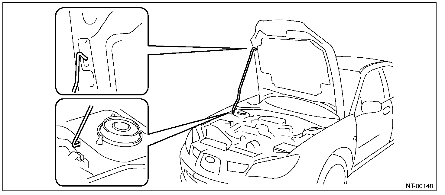 2. Set the upper end of stay into the hole of hood inner.