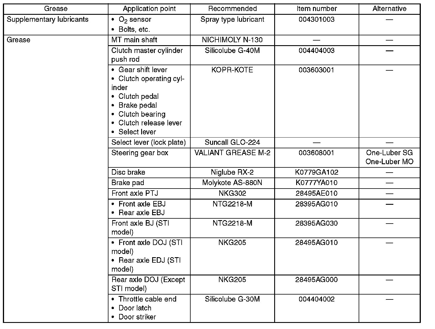 Use the grease and supplementary lubricants shown in the table.