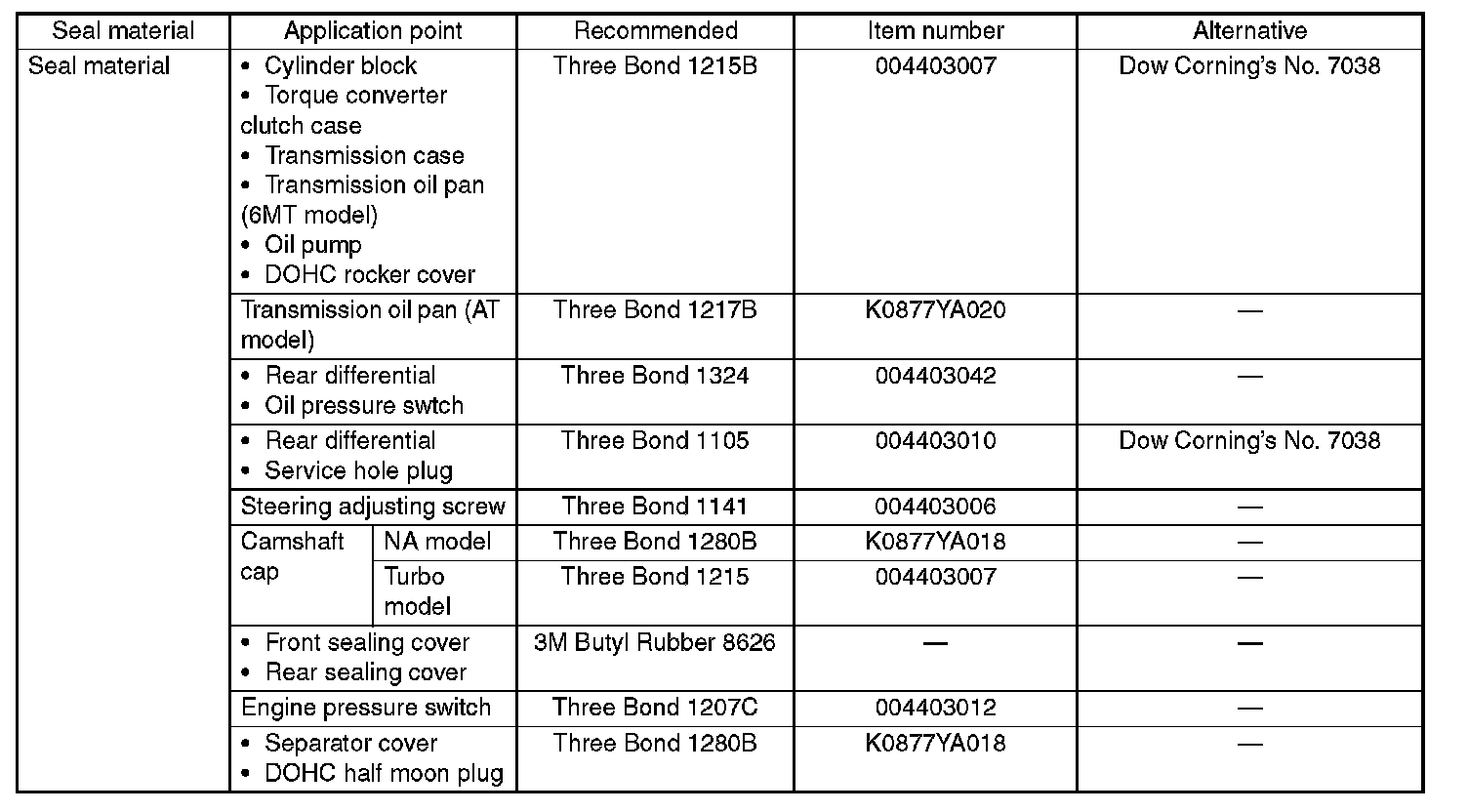 Use seal material shown in the table, or equivalent.