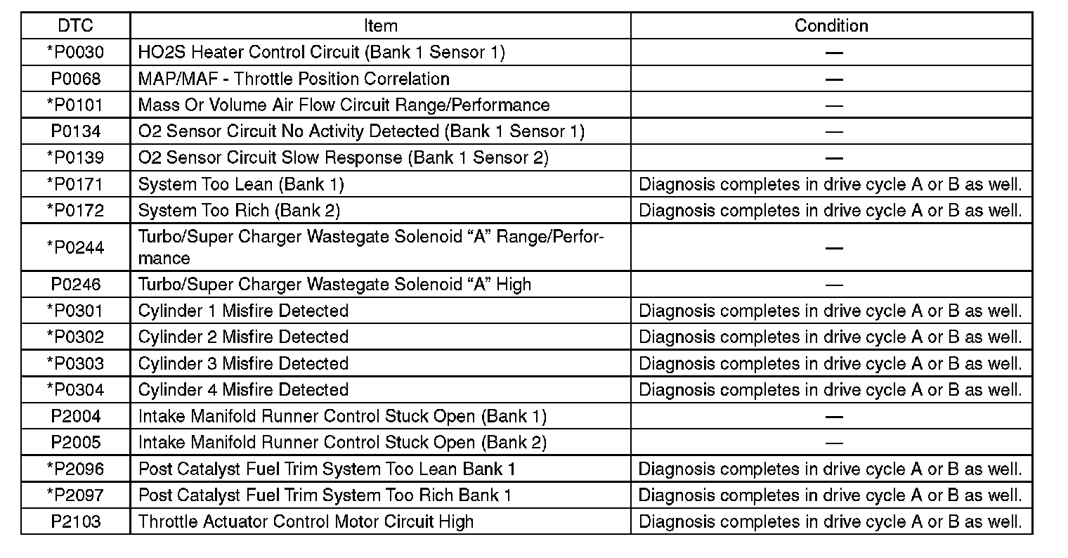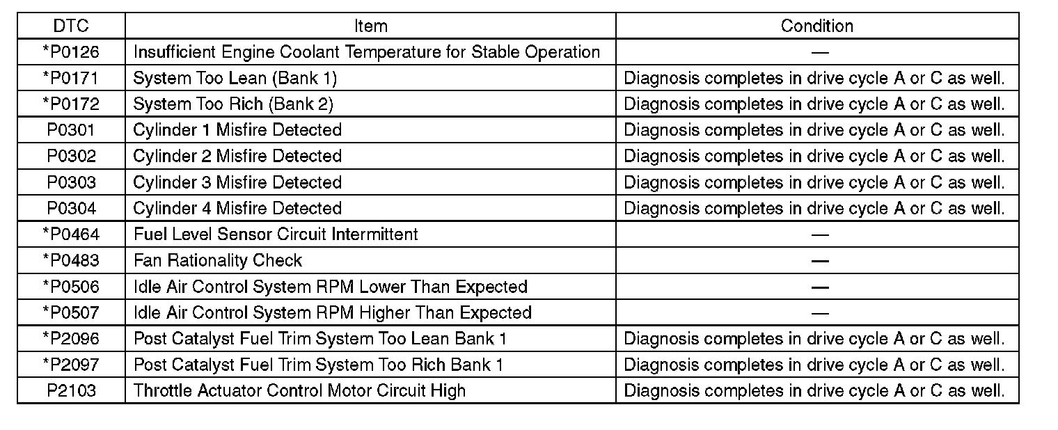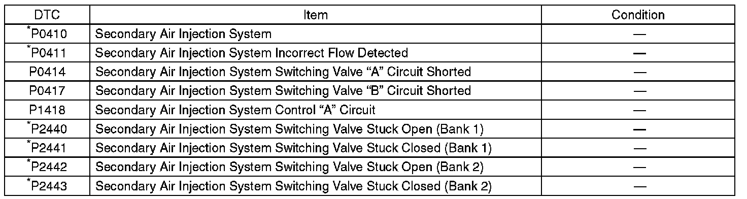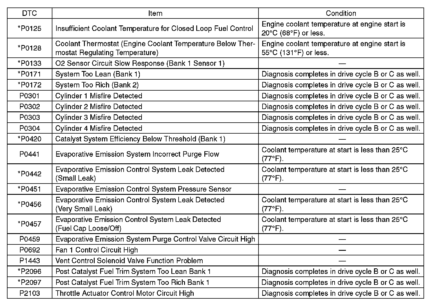- Perform the diagnosis twice if the DTC marked with*. After completing the first diagnosis, stop the engine and perform second diagnosis in same condition.