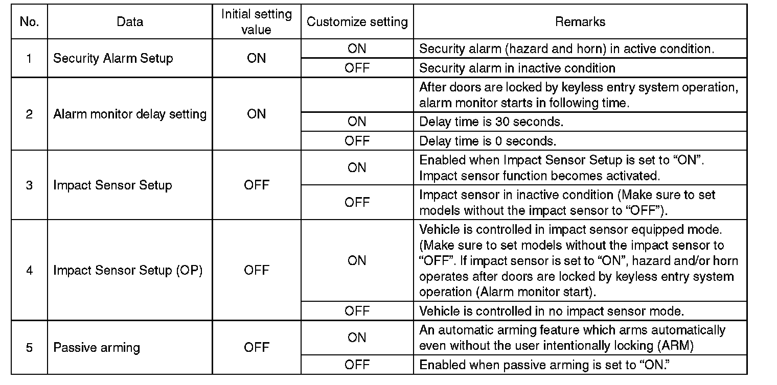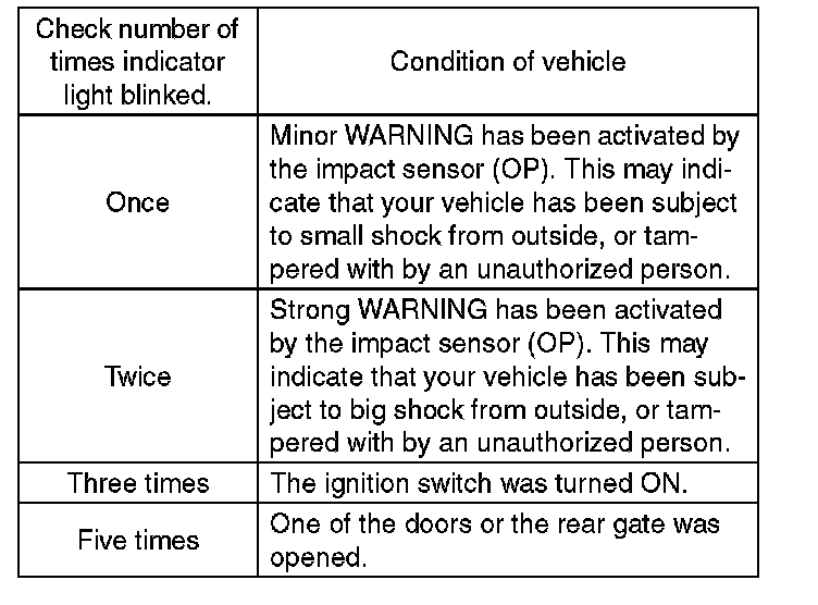 - If ALARM/WARNING occurs during the armed mode, the indicator light will flash at ignition OFF --> ON at the next DISARM.
