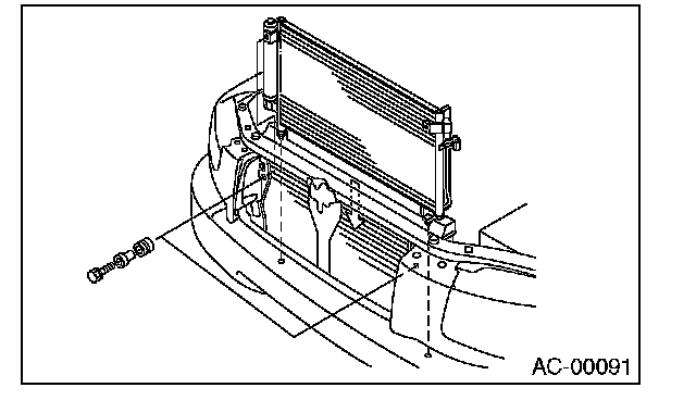 5. Remove two bolts. While lifting condenser, pull it out through space between the radiator and the radiator panel.