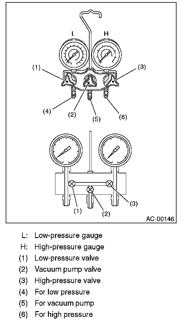 4. Operate the vacuum pump, then open the low-/high-pressure sides of the valve. Next, open the center manifold hose valve to begin vacuuming.