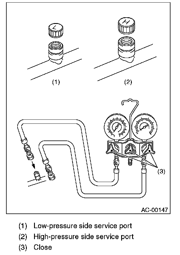 CAUTION: When starting the engine and filling, do not open the high pressure side valve. Always make sure to fill from the lower pressure side.