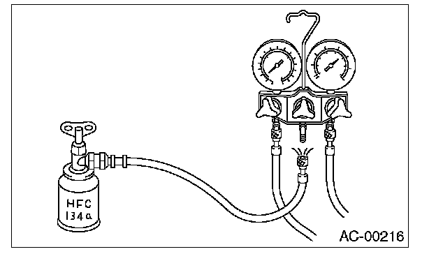18. If the HFC-134a source is empty, close all valves, close the valve on the can tap, and replace the empty source with a new part. After replacing HFC-134a source with a new part, and purging the air, restart the work.