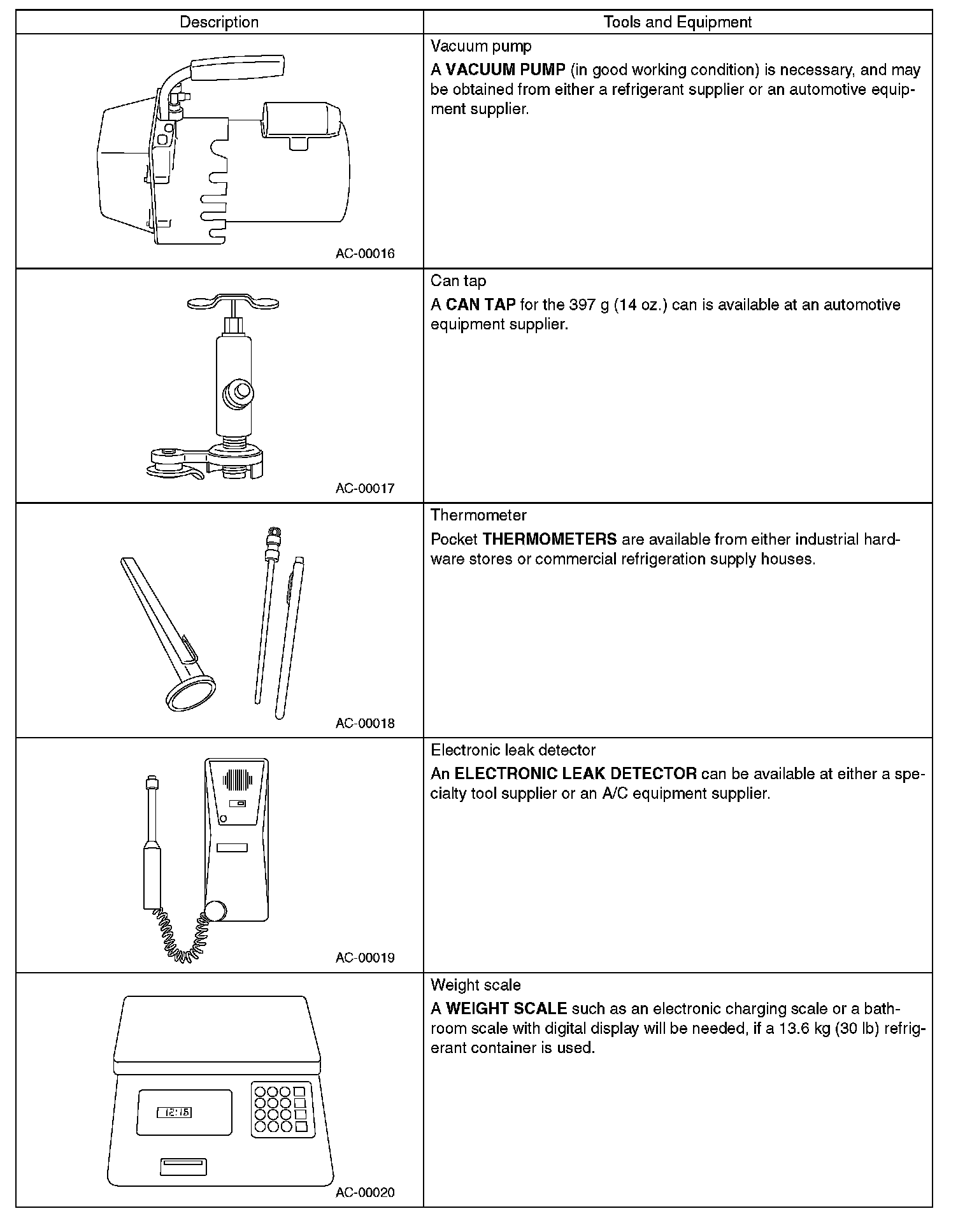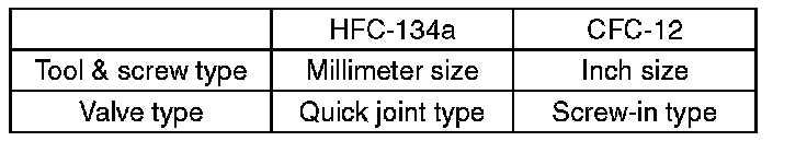 - In order to prevent the mixture of HFC-134a and CFC-12 parts and liquid, the tool and screw type and the type of service valves used are different. The gas leak detectors for the HFC-134a and CFC-12 systems must also not be interchanged.