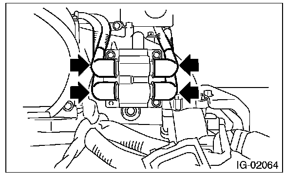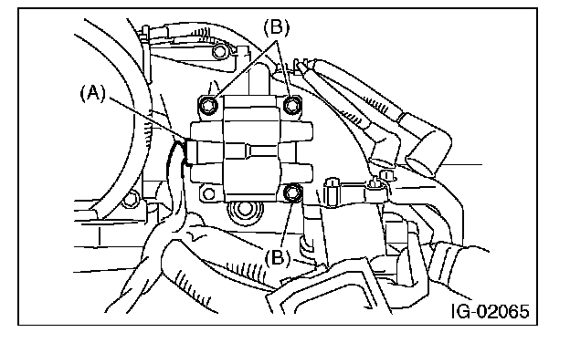 4. Remove the bolt (B) which secures the ignition coil and ignitor assembly to intake manifold.