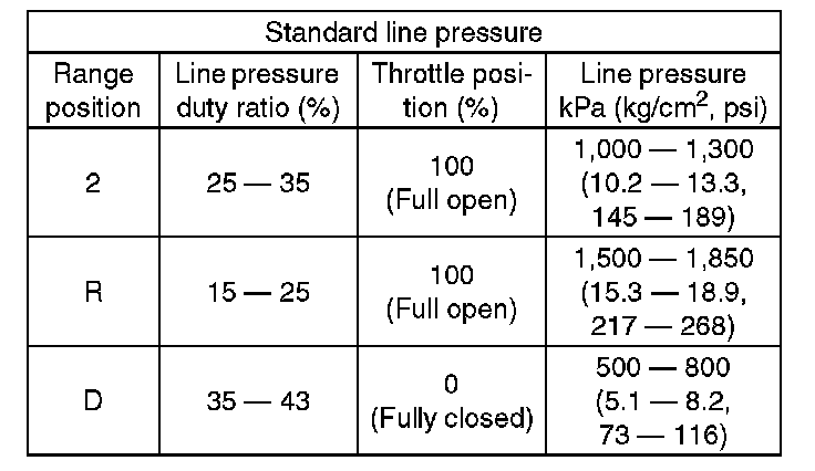 2) Measure the line pressure when the select lever is in "R" and "2" with engine under stall conditions.