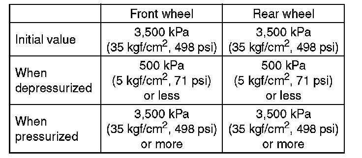 7) Read the values indicated on the pressure gauge and check if the fluctuation of the values between decompression and compression meets the standard values. Also check whether any irregular tightness of the brake pedal can be felt.