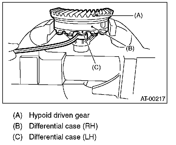 ^ Hold the differential case assembly by hand to avoid damaging the retainer mounting hole of the converter case.