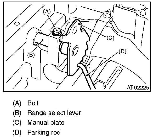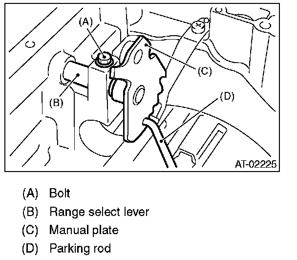 12) Remove the bolts securing the range select lever, then remove the range select lever, manual plate and parking rod.