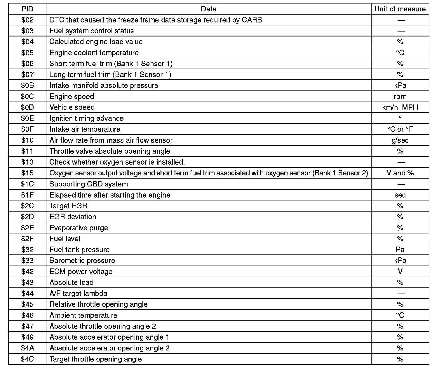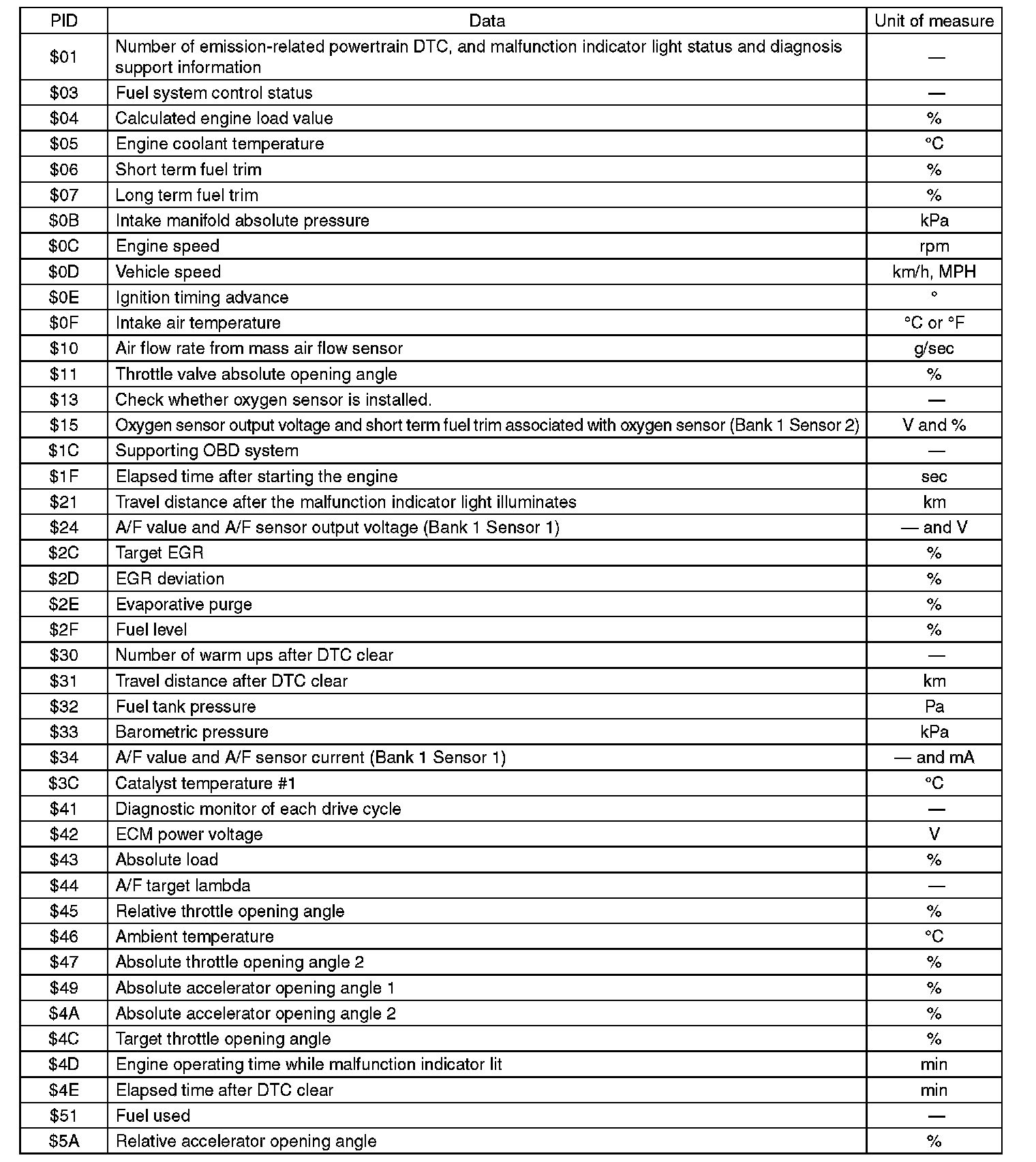 A list of the support data and PID (Parameter Identification) codes are shown in the following table.