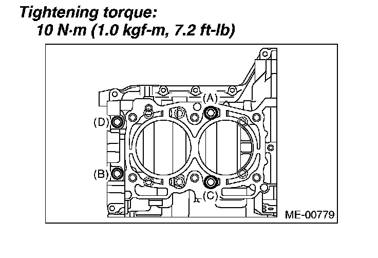 Tighten the 10 mm cylinder block connecting bolts on LH side (A - D) in alphabetical sequence.